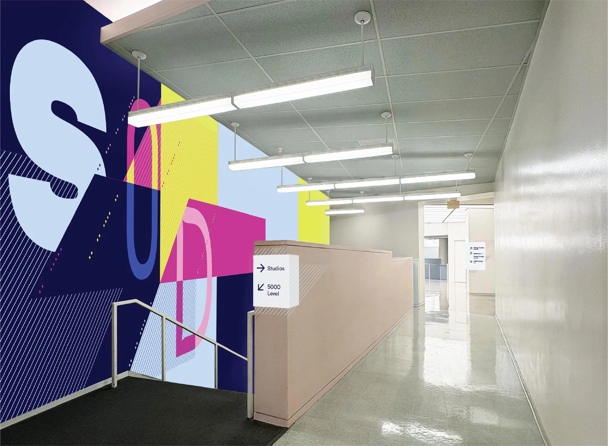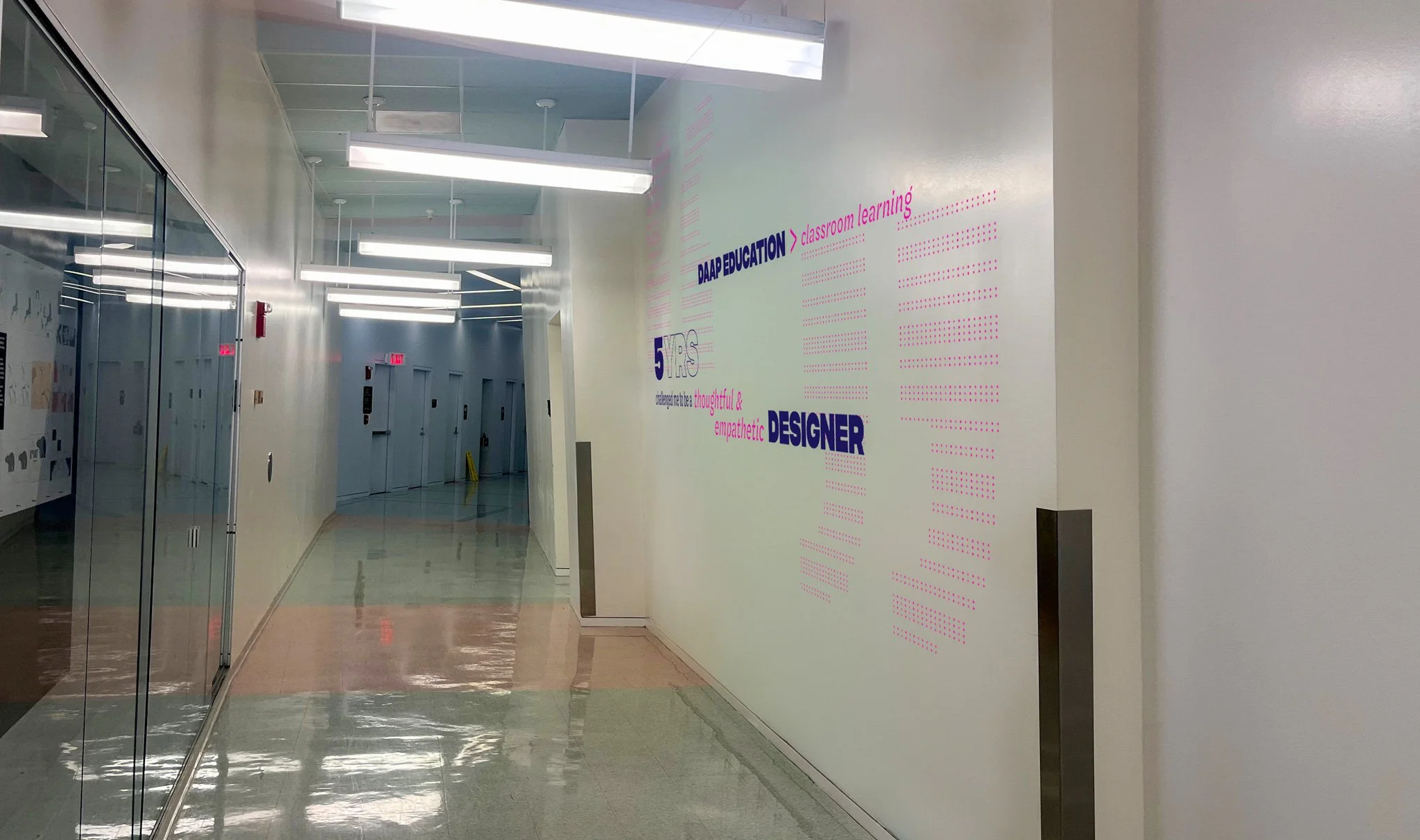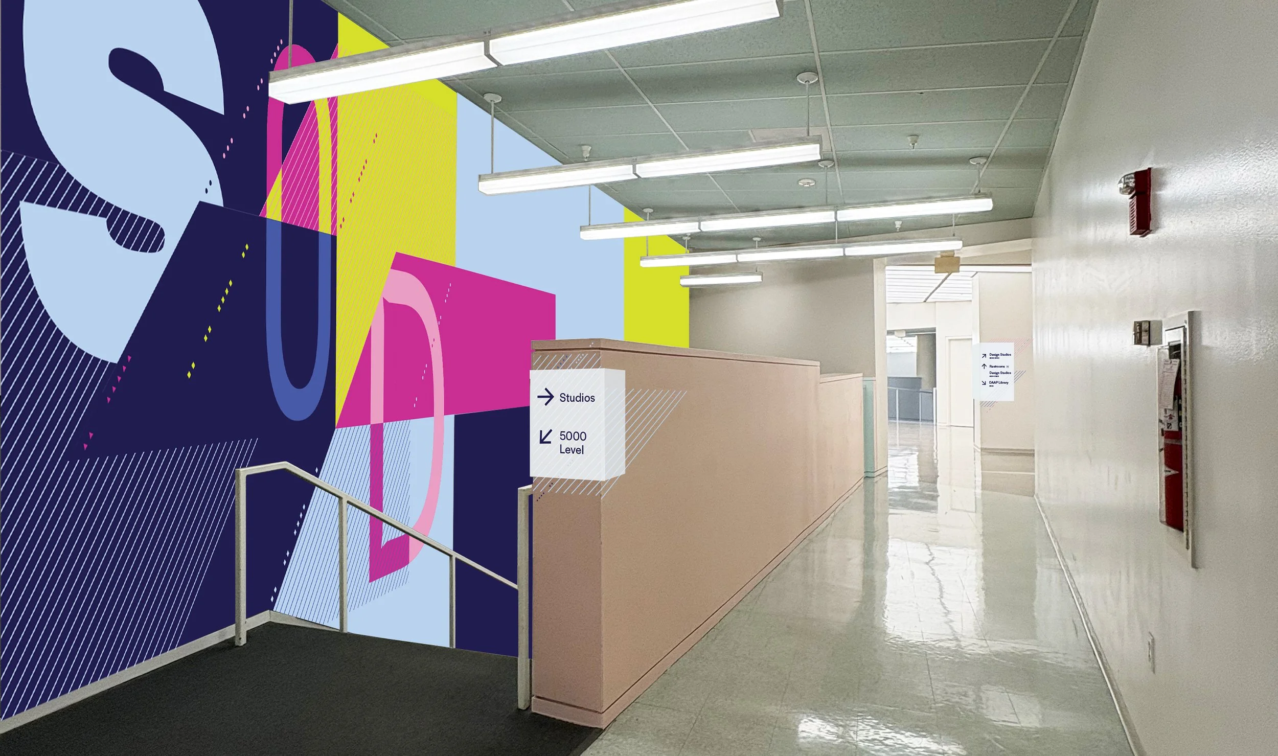 A unified wayfinding and identity system, drawing from DAAP’s unique architectural patterns, connecting student disciplines in a creative and expressive way.
