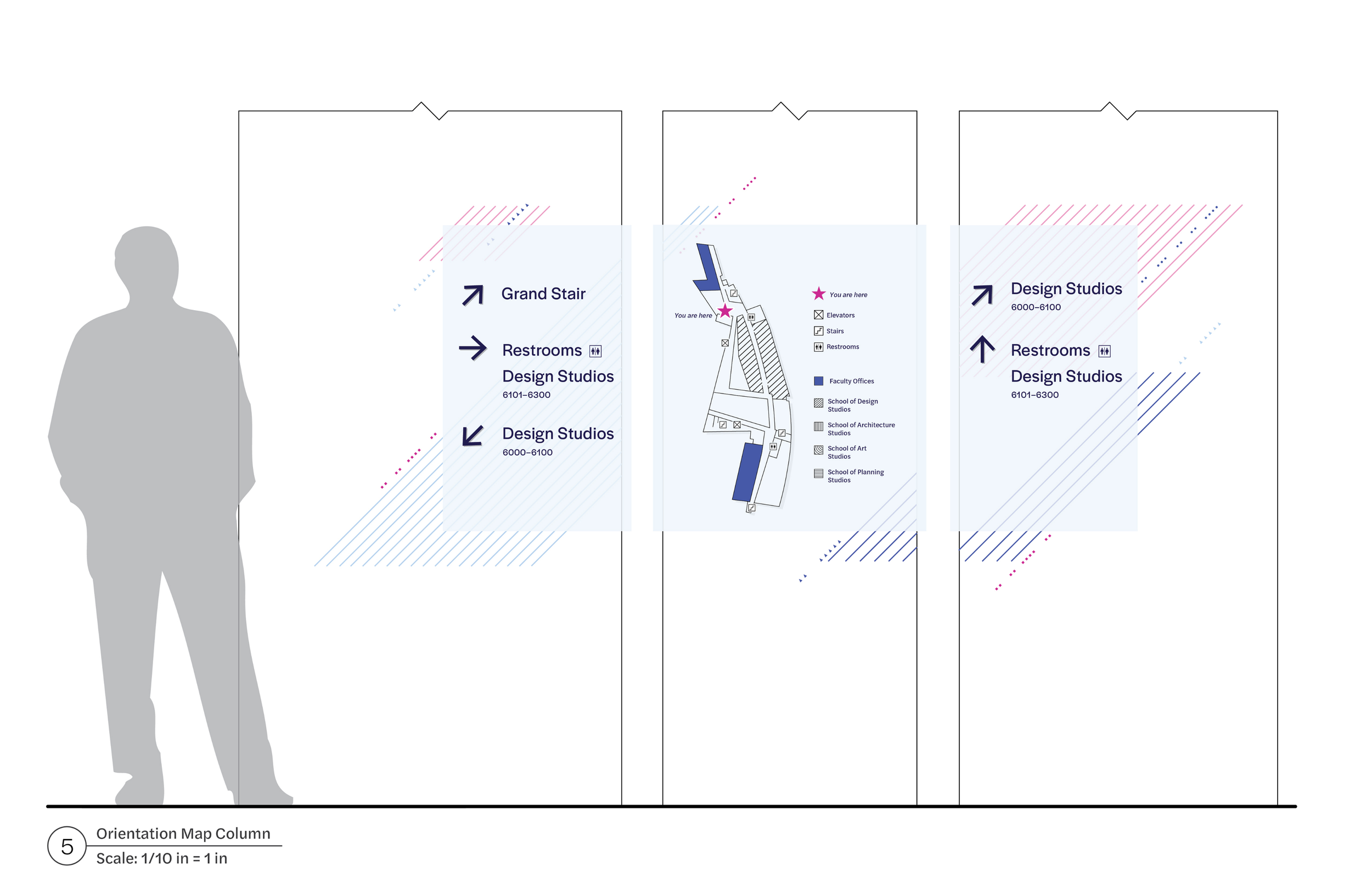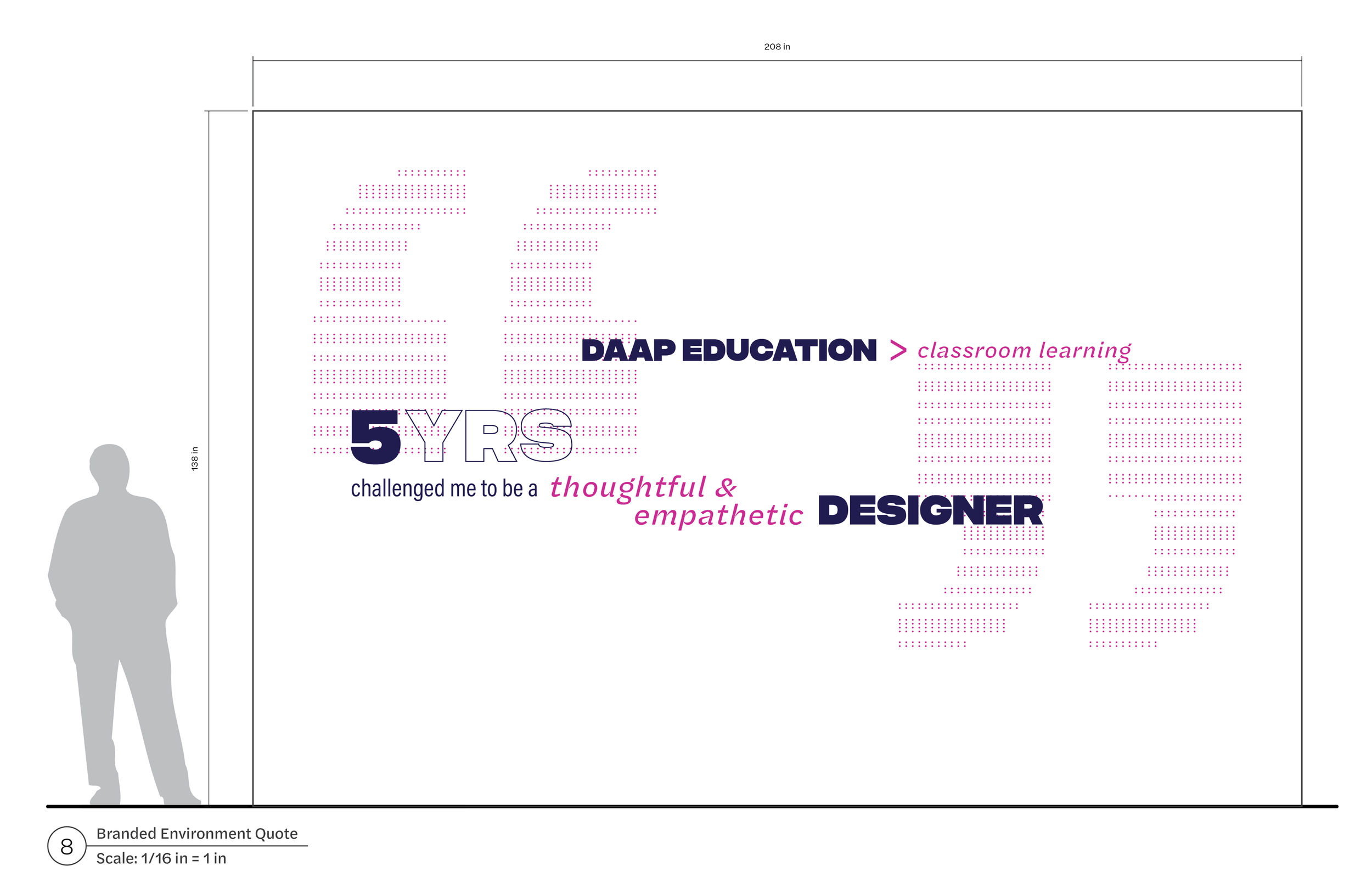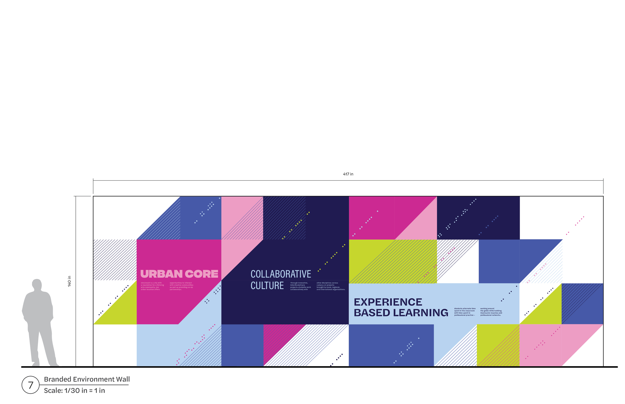 A unified wayfinding and identity system, drawing from DAAP’s unique architectural patterns, connecting student disciplines in a creative and expressive way.
