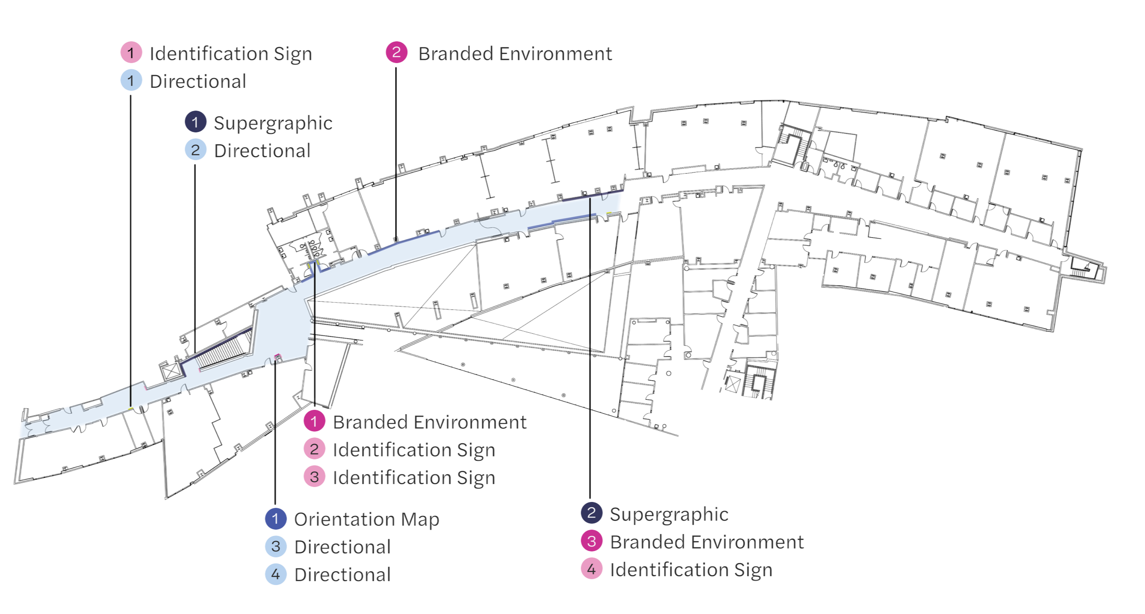 We used breadcrumbing as a way to build up and create moments for users to dwell. Through thoughtful development we made sure our system would translate well across the signage plan and all decision points which allowed us to feel confident in the visual hierarchy.