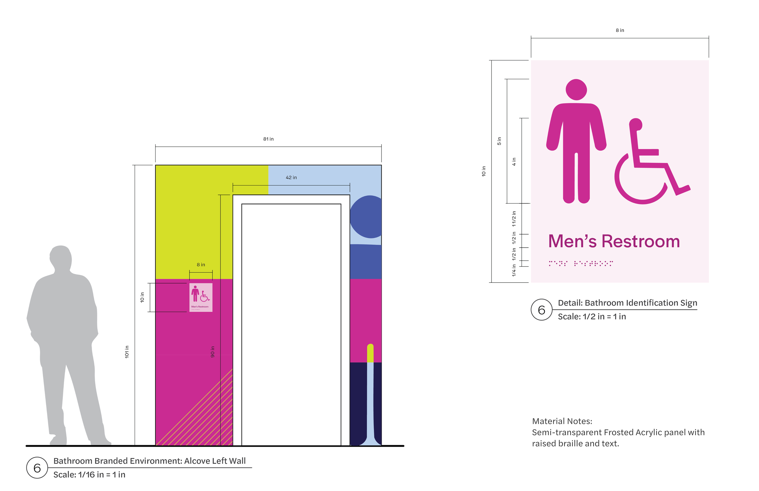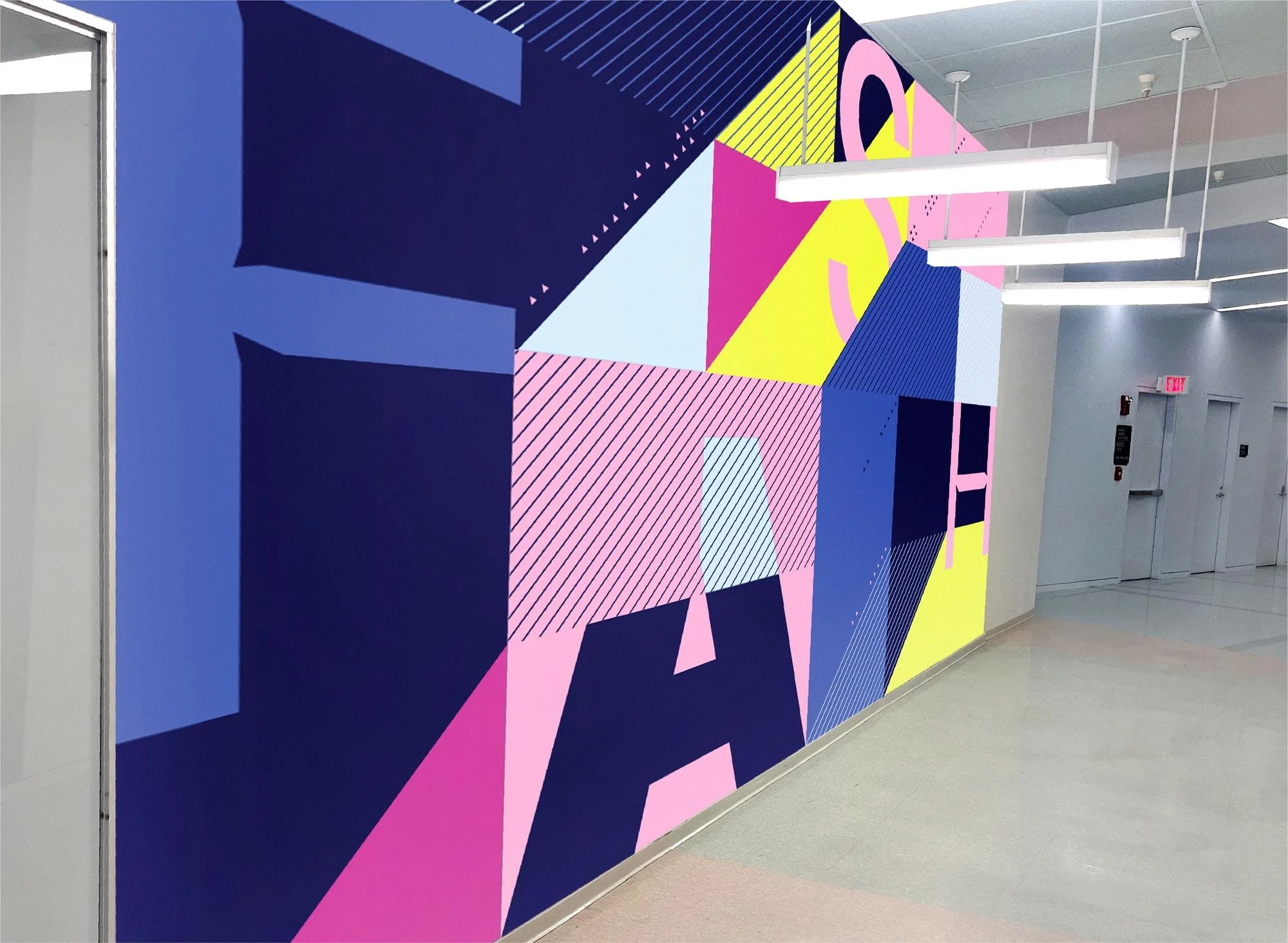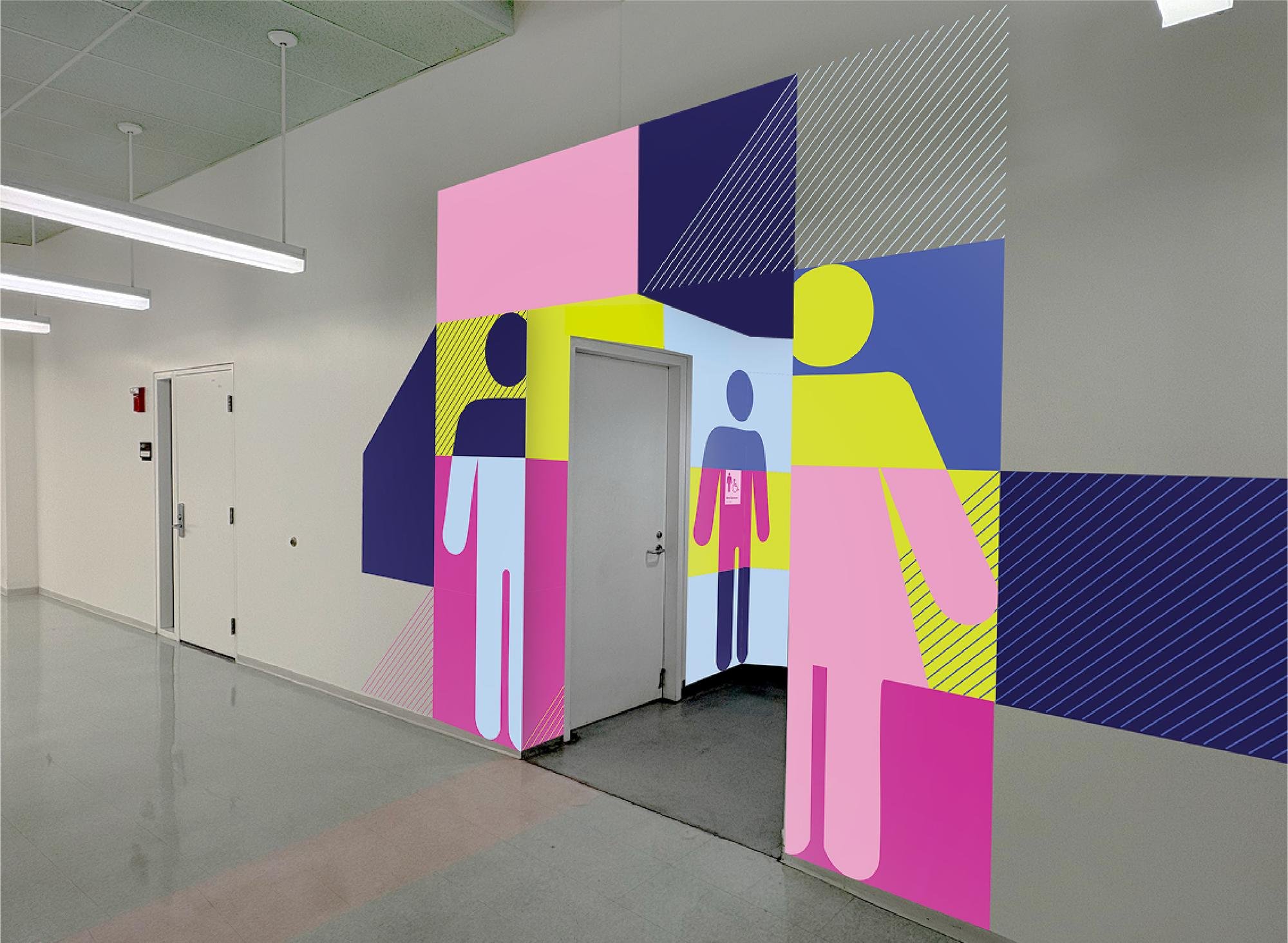 Playing with our system in largest scale, supergraphics, before finalizing signage designs was an approach we took to intentionally incorporate our kit of parts in a way that felt seemless.