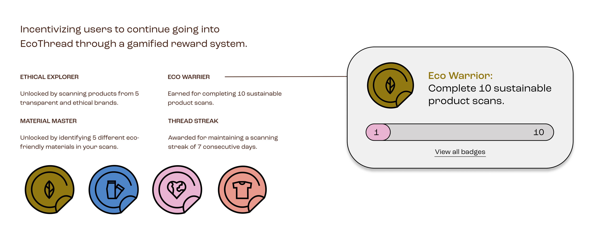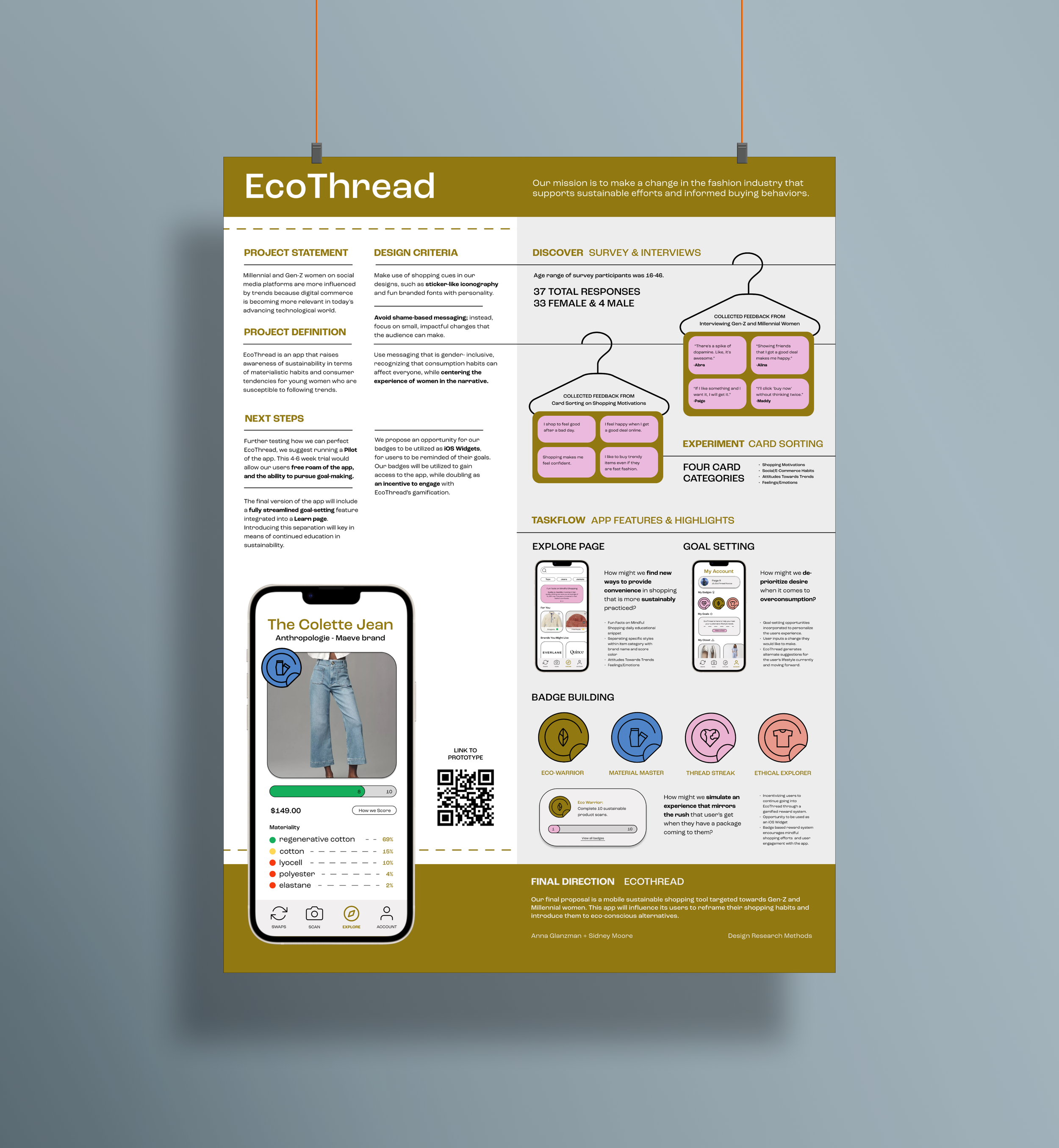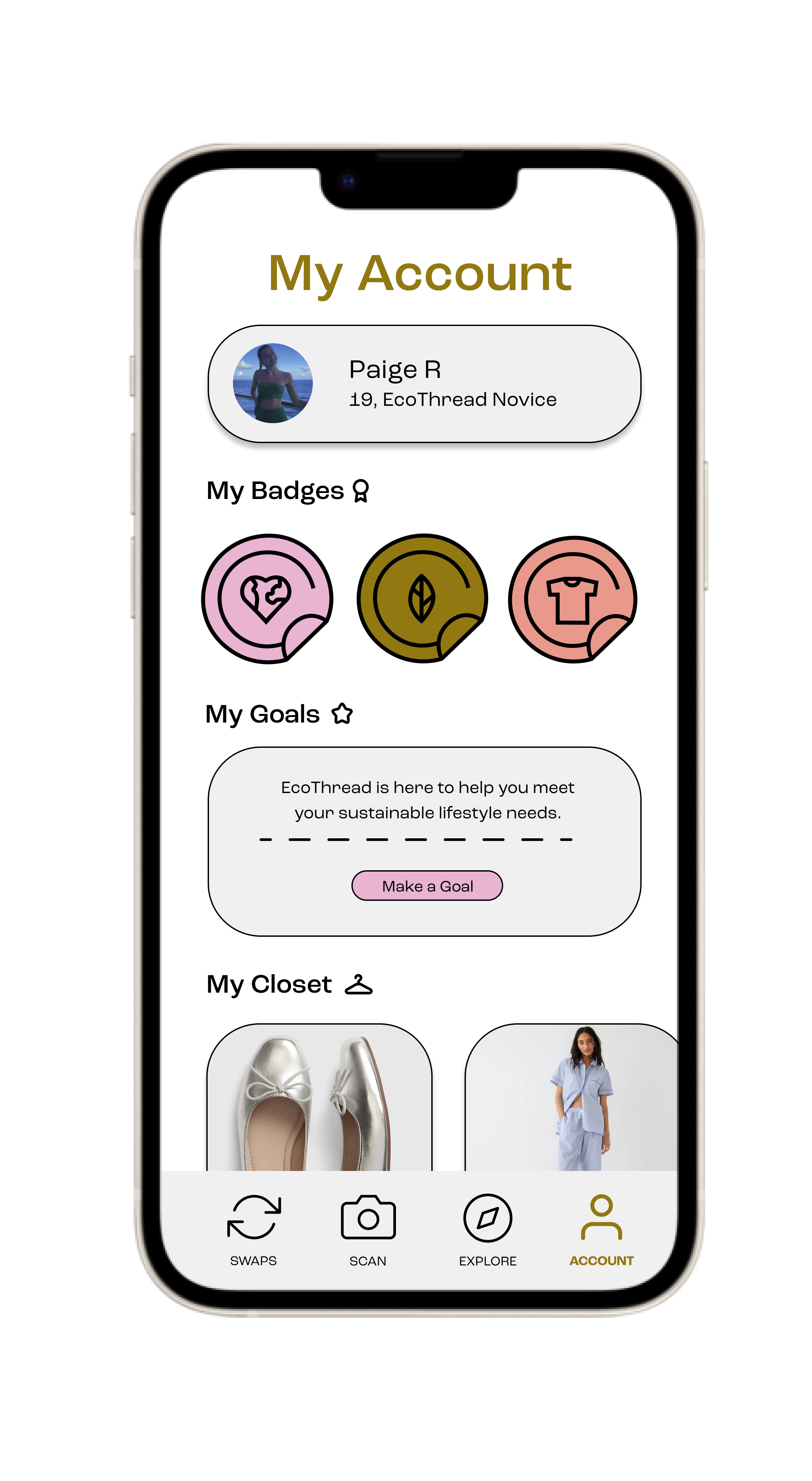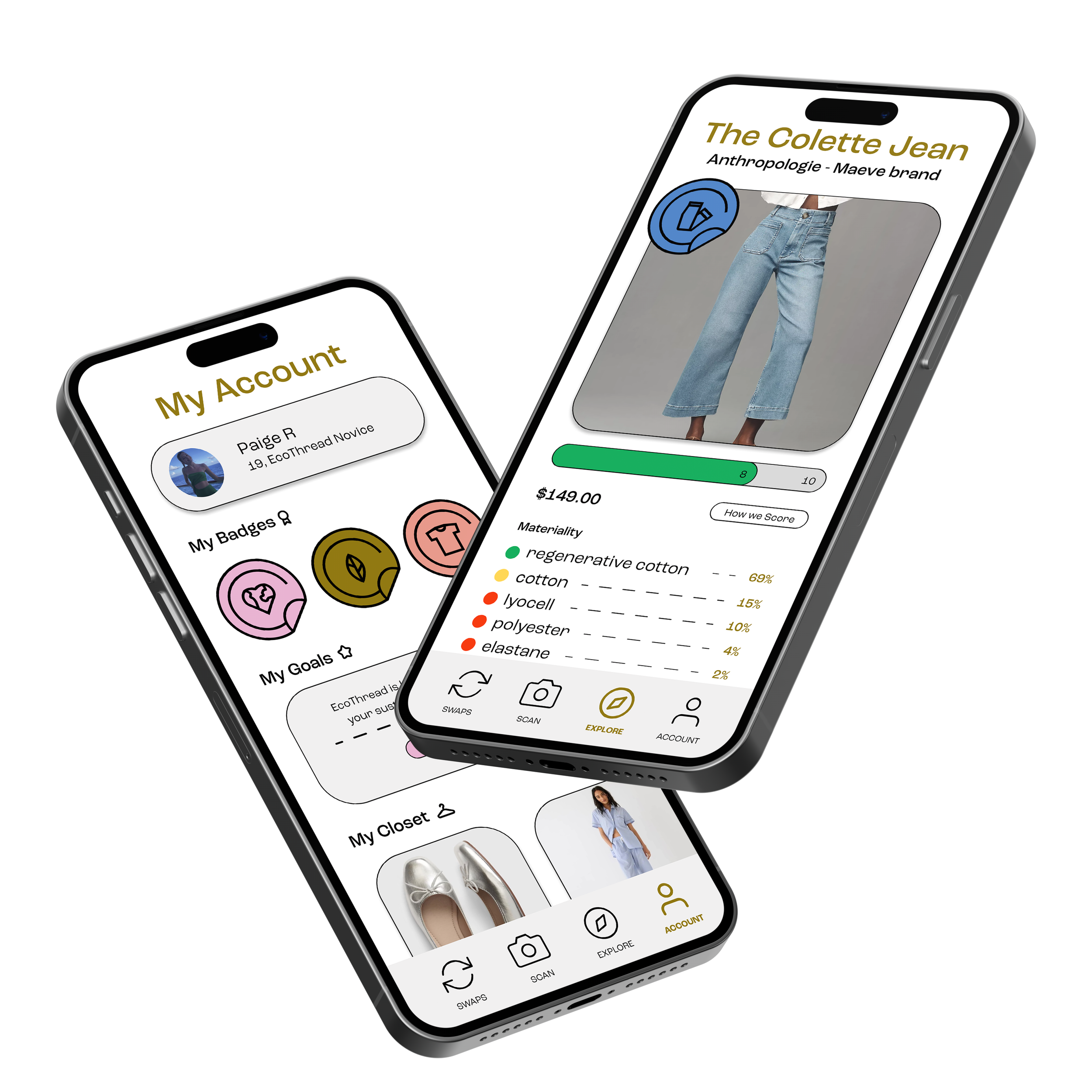 A mobile application that gives users the ability to be fully informed on clothing sustainability. By scoring and organizing item information in terms of materiality and brand transparency, EcoThread focuses on education. Through gamified goal-making and providing similar, but more sustainable, clothing recommendations, users become more aware of their consumption choices.