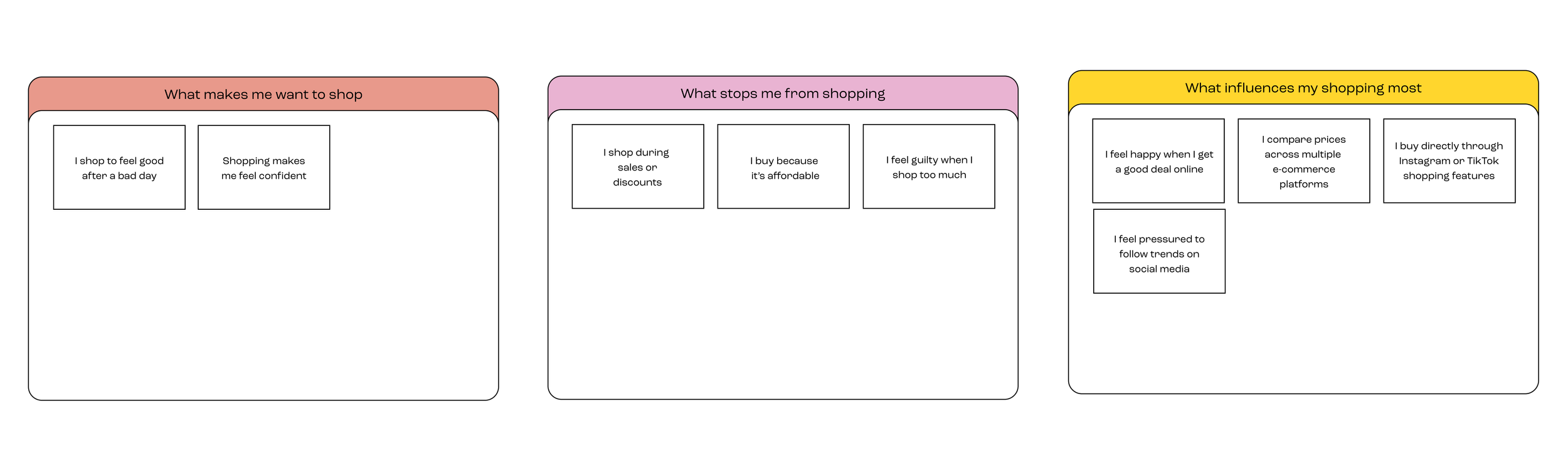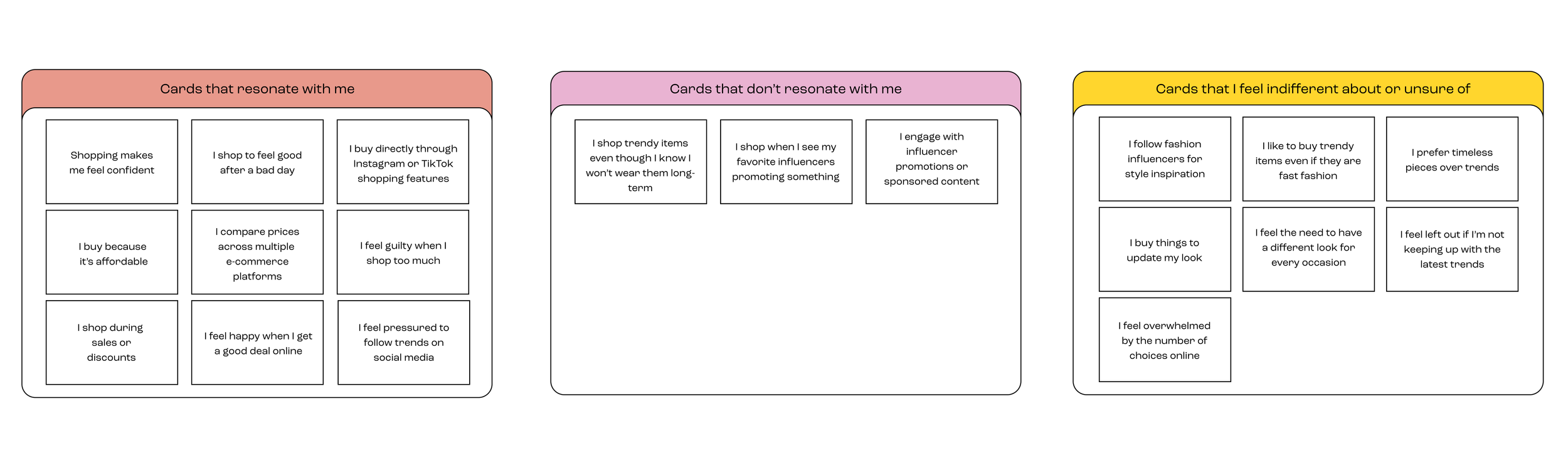 The collection of insights was gathered from surveys, interviews, and card sorting activities. Understanding psychological triggers, the influence of social media, perception of trends, and consumer behavior patterns were some of the learning objectives.