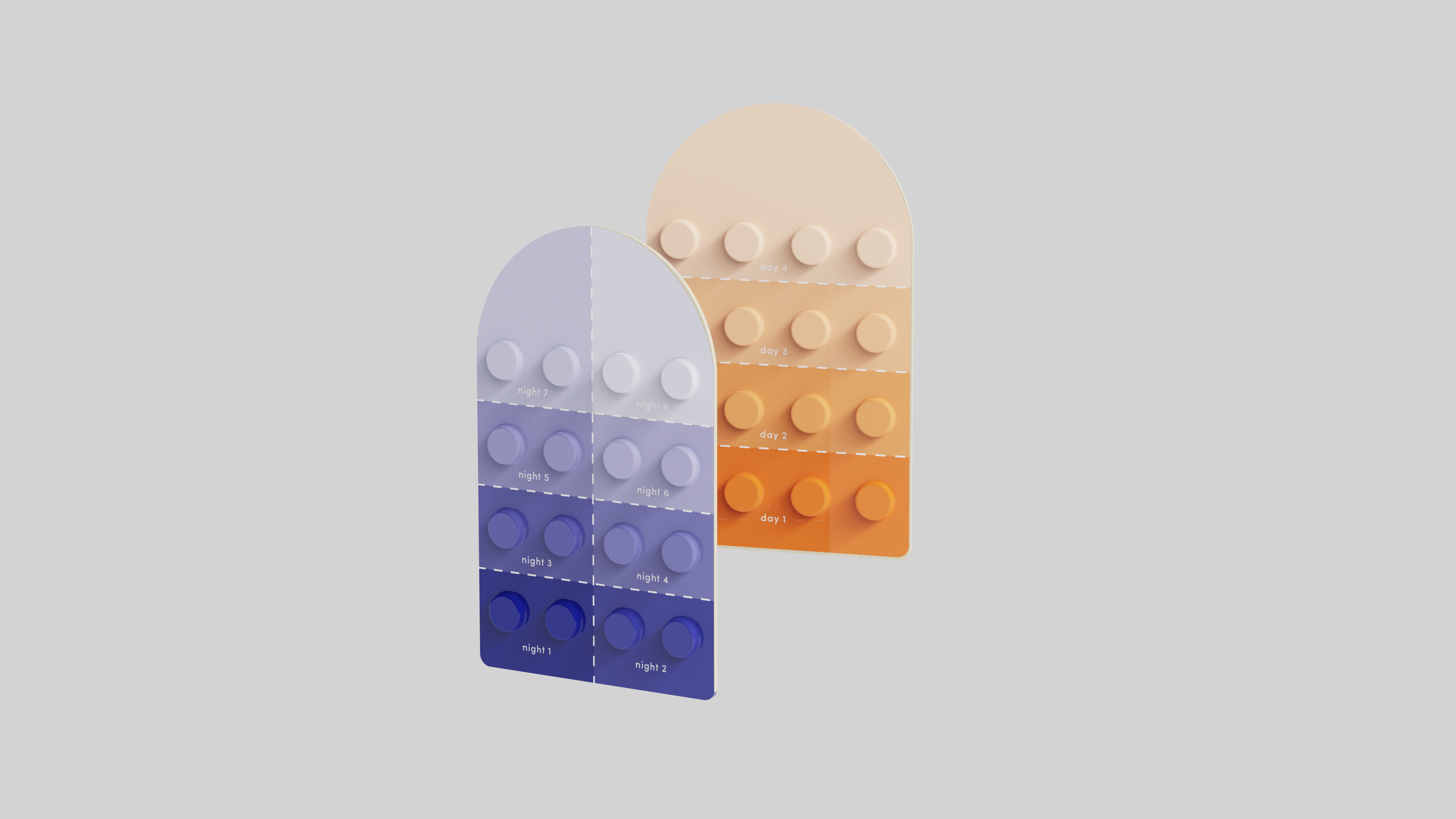 Blister packs are labeled and organized by daily dosage for easiest user experience. Daytime and nighttime blister packs are designated by label and color gradients. The hinged lid for convenience and color changing strip to clearly indicate expiration status.